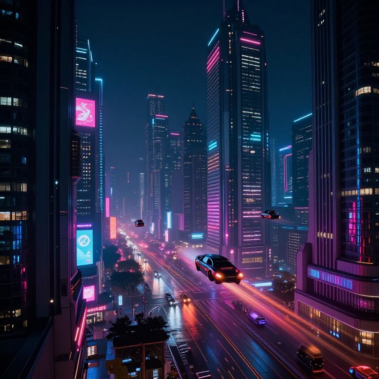 Dldl futuristic cityscape at night, neon lights reflecting on wet streets, cyberpunk atmosphere, flying cars zooming through skyscrapers, vivid colors with deep shadows, highly detailed urban environment, surreal technology blending with architecture