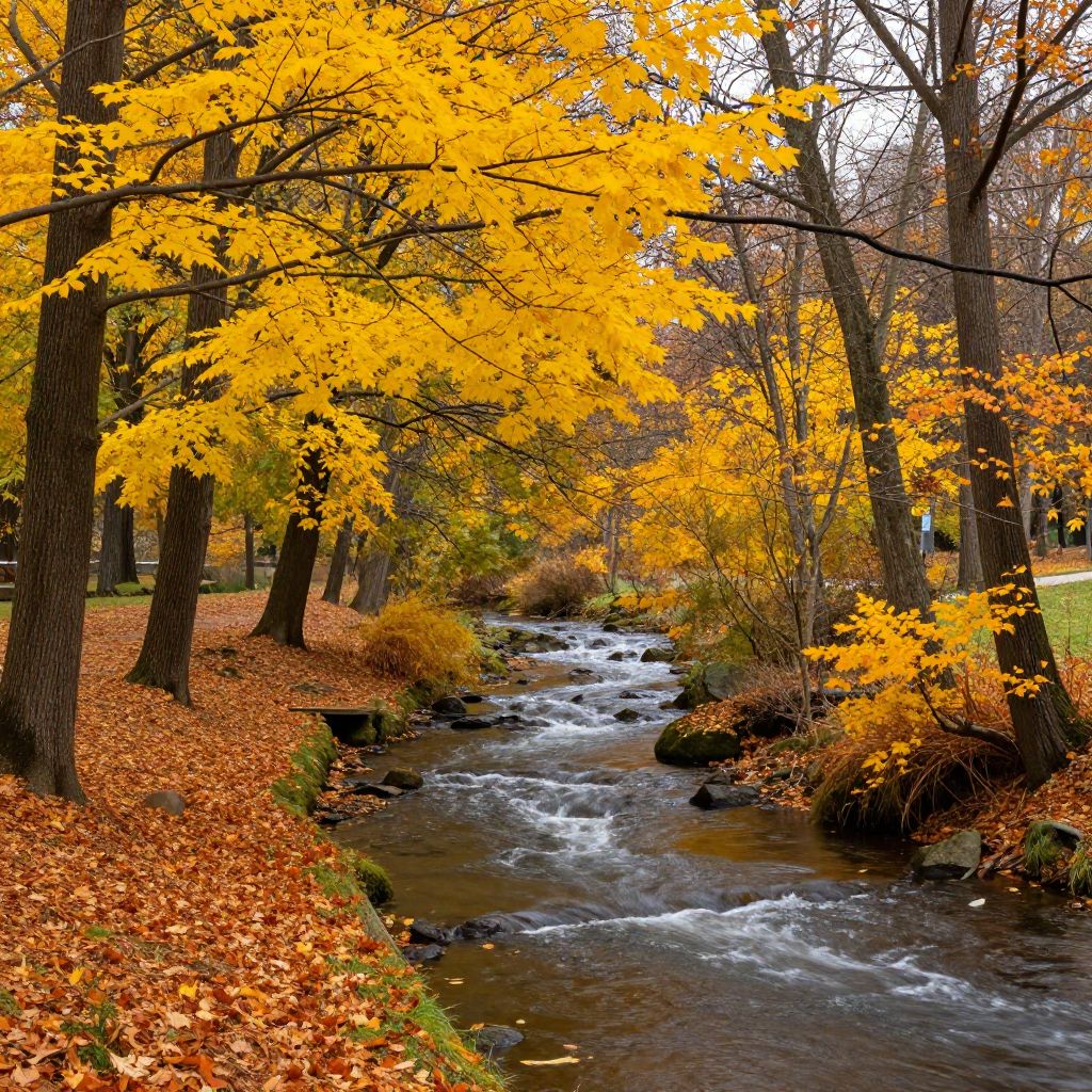 A serene autumn scene featuring a flowing stream bordered by trees with vivid yellow leaves and orange fallen foliage, creating a vibrant fall landscape in a park setting.