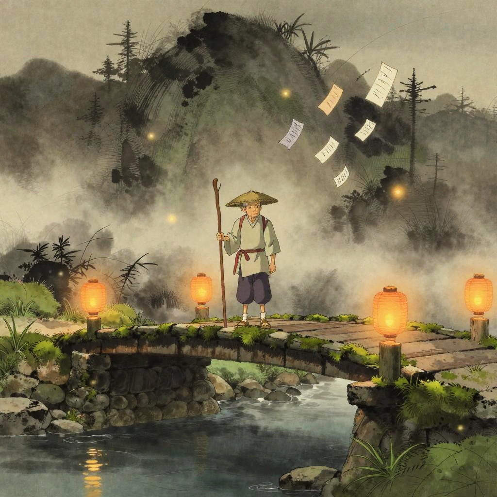 Spirited Away-inspired fantasy at a moss-covered stone bridge over a misty stream; an elderly man with a straw hat and wooden staff stands amid glowing lanterns and fluttering paper talismans. traditional sumi-e ink painting aesthetic with delicate linework, soft edges, and subtle washi texture. Cinematic composition with leading lines and a clear vanishing point, muted earth tone grading, volumetric light, gentle fog, soft bokeh, polished wood reflections, high detail, subtle film grain, calm, wistful mood.