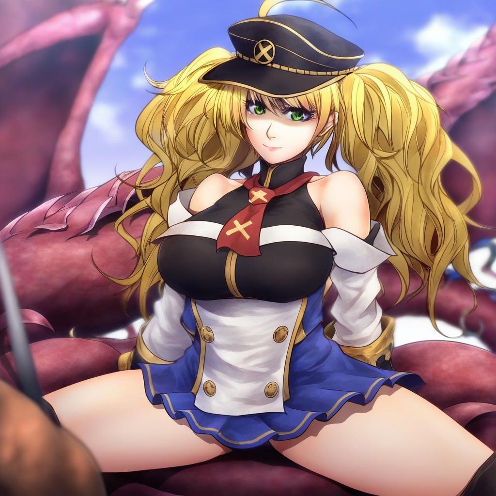 Monika weisswind, granblue fantasy, 1girl, brown eyes, green eyes, blonde hair, long hair, wavy hair, twintails, ahoge, large breasts, thighs, peaked cap, bare shoulders, by artist ryuuichi (f dragon), leet