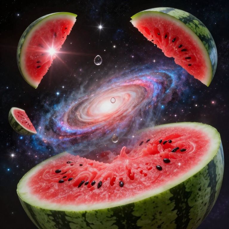 Galaxies spiral inside hollowed-out watermelons, each drop of juice a starburst of color and cosmic energy suspended in gravity-defiant harmony.