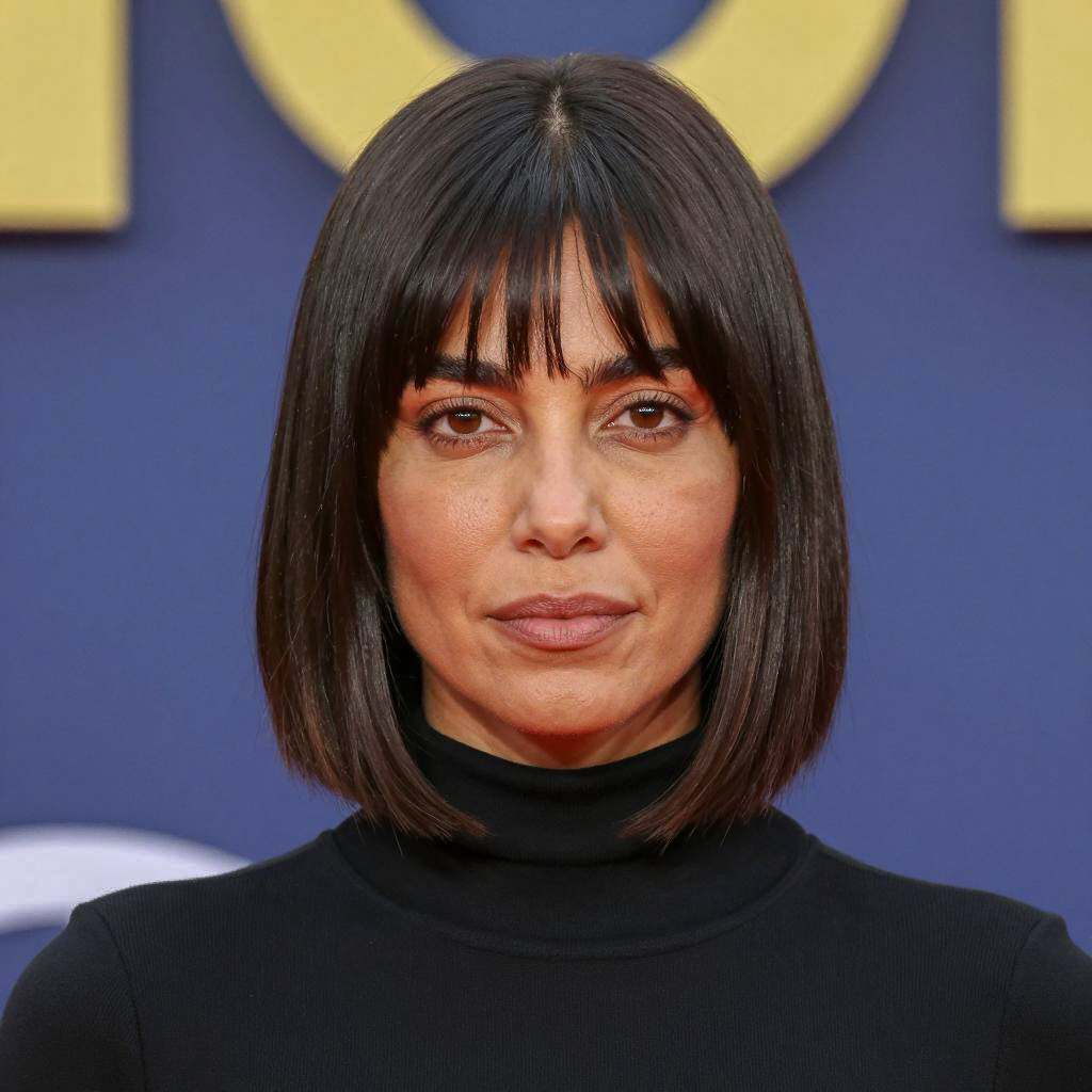 Photograph of a woman with a straight, dark brown bob haircut with bangs. She has brown eyes, neutral expression, and wears a black turtleneck. Background is blurred with indistinct blue and yellow shapes. She faces forward, centered.