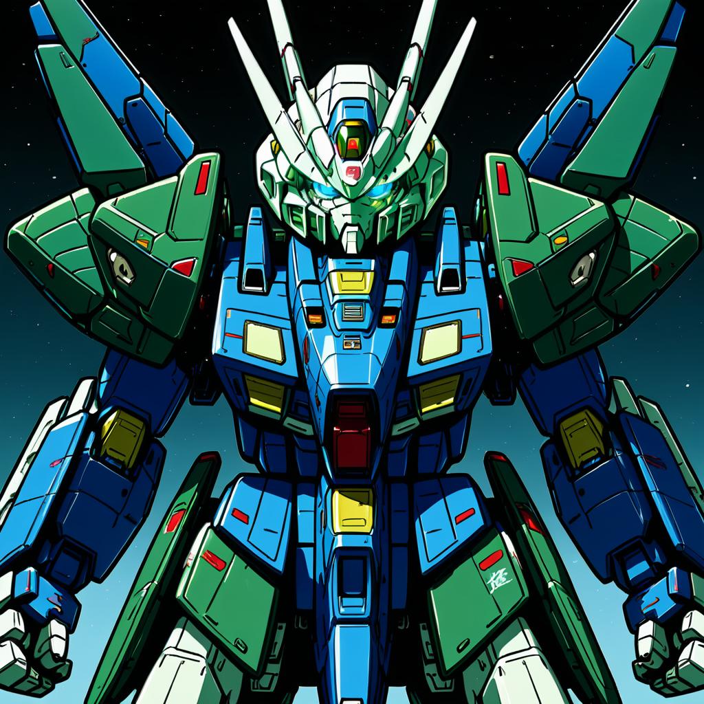 A detailed anime-style illustration of a blue and green Gundam mecha robot with glowing blue and green eyes, prominent v-fin antennae on the head, and heavy armor plating. The robot is designed as a mobile suit with intricate mechanical details, standing against a dark starry background.