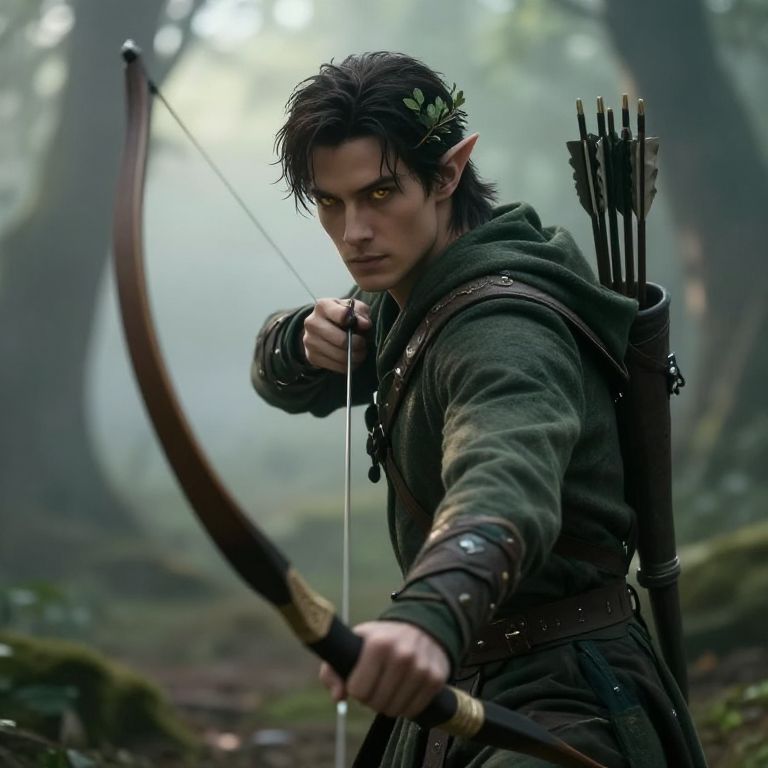 Digital artwork of a serious, elf-like archer with dark hair, green hooded cloak, and quiver of arrows, drawing bow in misty