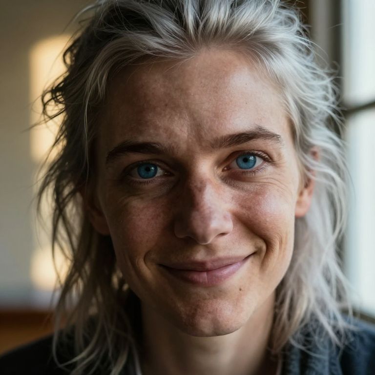 An enigmatic individual with dreamy blue eyes and silver-streaked hair, styled in an untamed mane, is the subject of this intricate portrait. Their captivating smile is adorned with a subtle dimple, drawing viewers in. Rendered in the style of fine art photography, the subject's gaze directs our focus to the soft, golden light filtering through a nearby window. This gentle illumination casts subtle shadows on their weathered skin, a testament to a life fully lived. The unusual, close-up 'bug's-eye' perspective reveals a complex interplay of emotions in their expression, ranging from warmth and confidence to hints of vulnerability and curiosity. This evokes a sense of deep connection and shared humanity with those who observe it amidst their everyday struggles and triumphs.