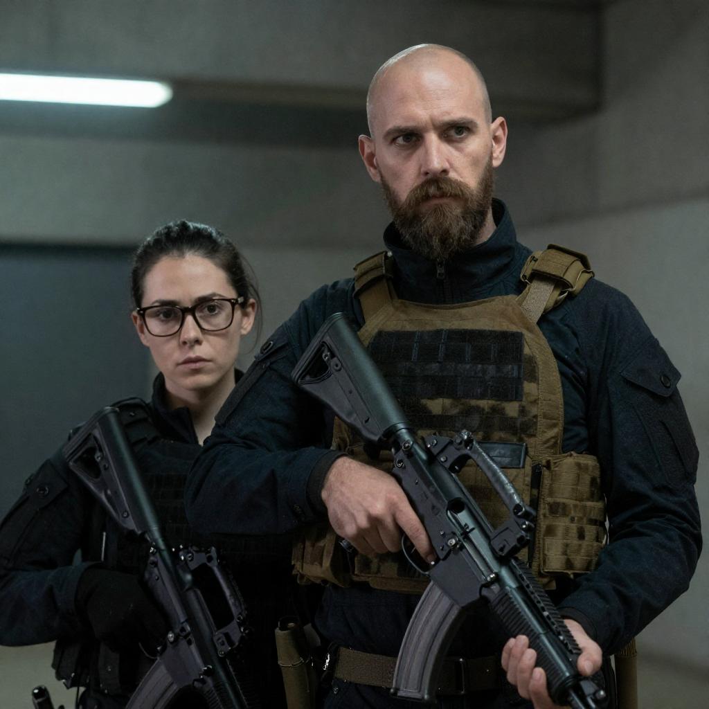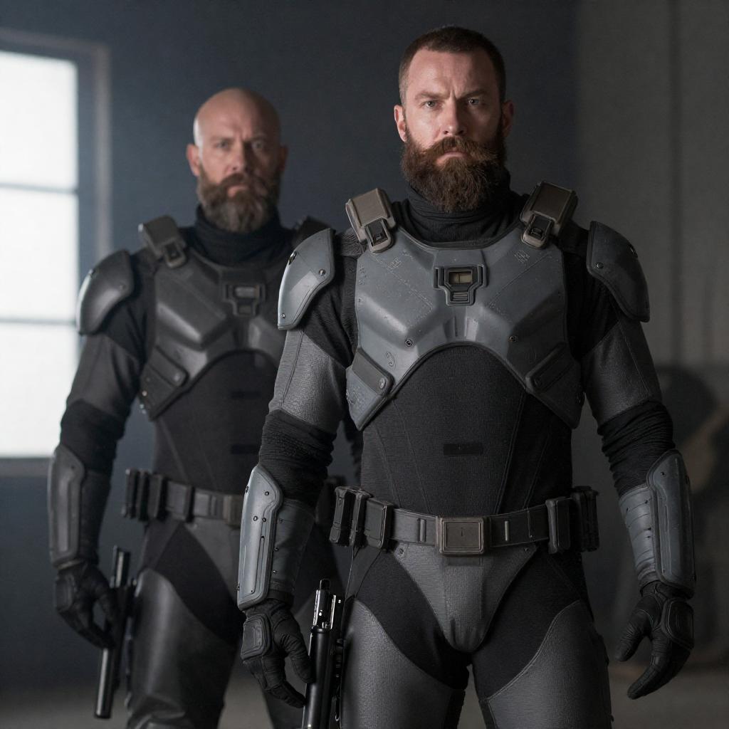 Photograph of two bearded men in futuristic, armored suits with gray and black patterns, standing in a dimly lit, industrial setting. The man in the foreground has a serious expression, holding a gun, while the man in the background looks ahead. Bright light from the left creates a strong contrast.