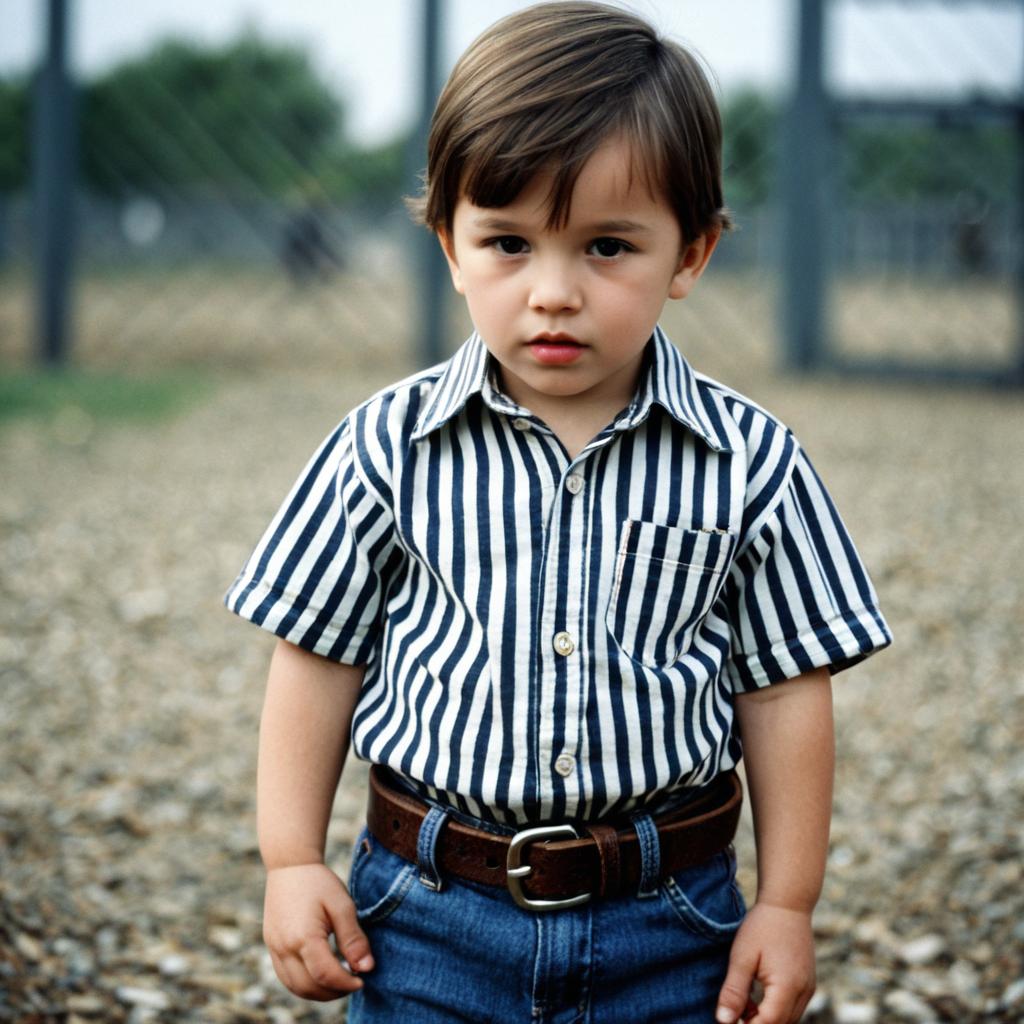 Portrait of a young toddler boy with brown hair wearing a vertically striped short-sleeve collared button-down shirt, paired with blue denim jeans and a brown belt. The child is standing outdoors on a gravel surface with a blurred background, looking directly at the camera.