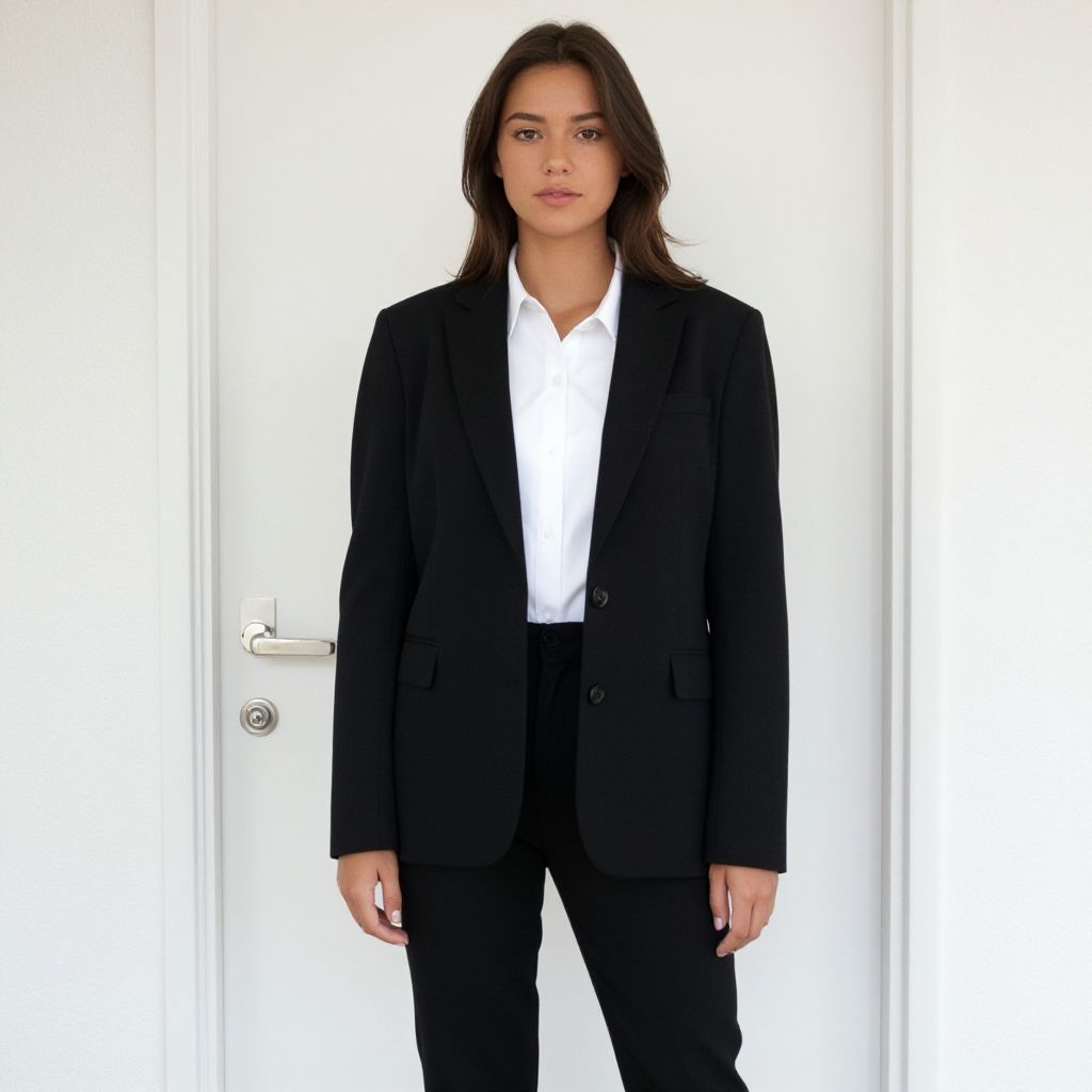Portrait of a stylish fit woman posing indoors wearing a black blazer, sheer cream blouse, and olive green tailored shorts. The soft natural lighting highlights the smooth textures of the fabric against a neutral, minimalistic background, emphasizing an elegant and modern fashion style.