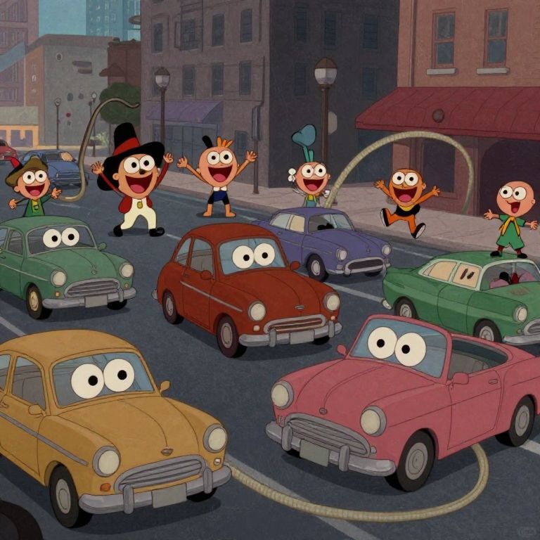 Cartoon street scene with six smiling, wide-eyed cars and four excited, stick-figure people jumping between vintage cars on a city street.