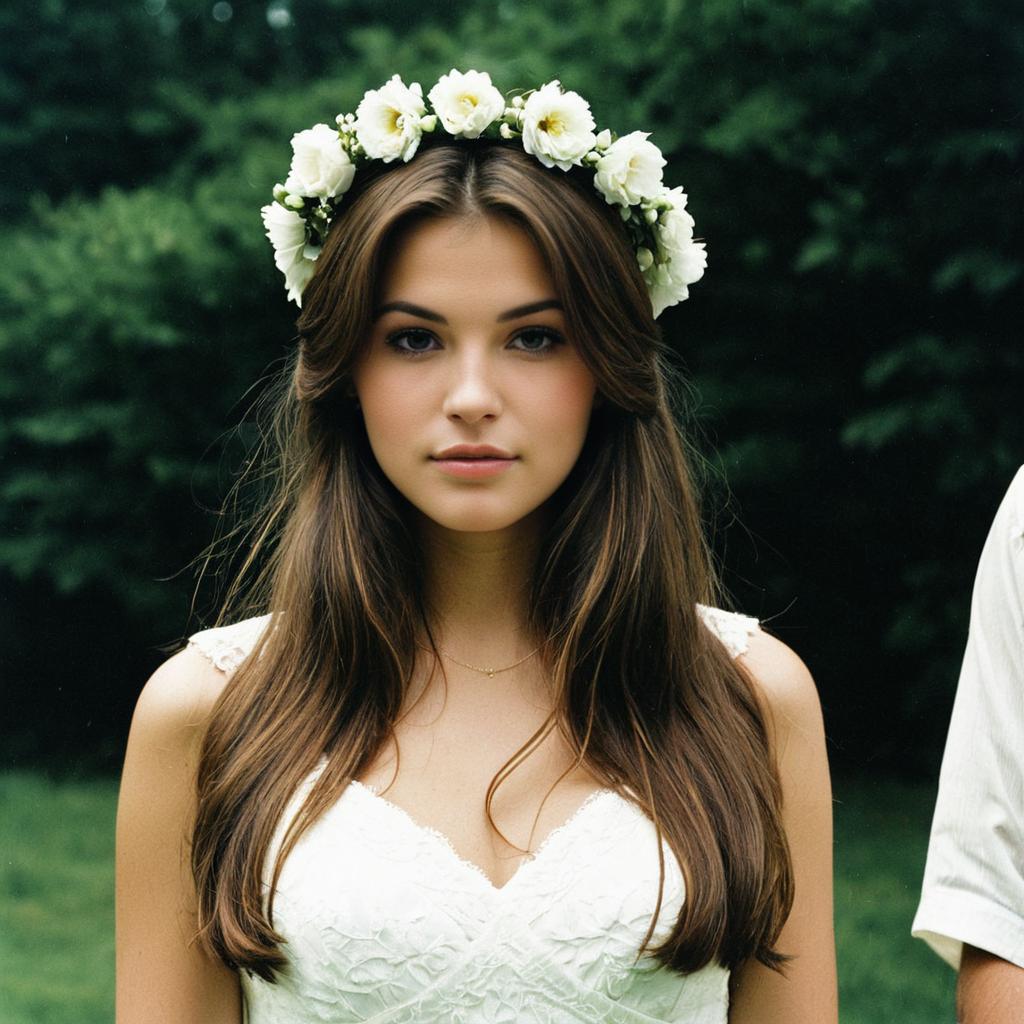 Summer casual wedding attire,1girl, solo, dress, brown hair, long hair, brown eyes, realistic, head wreath