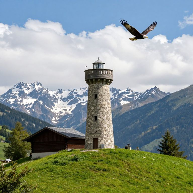 Stone tower stands majestically atop a verdant hill, flanked by a wooden cabin and surrounded by lush greenery, with a soaring eagle gliding above against a backdrop of snow-capped mountains and fluffy white clouds.