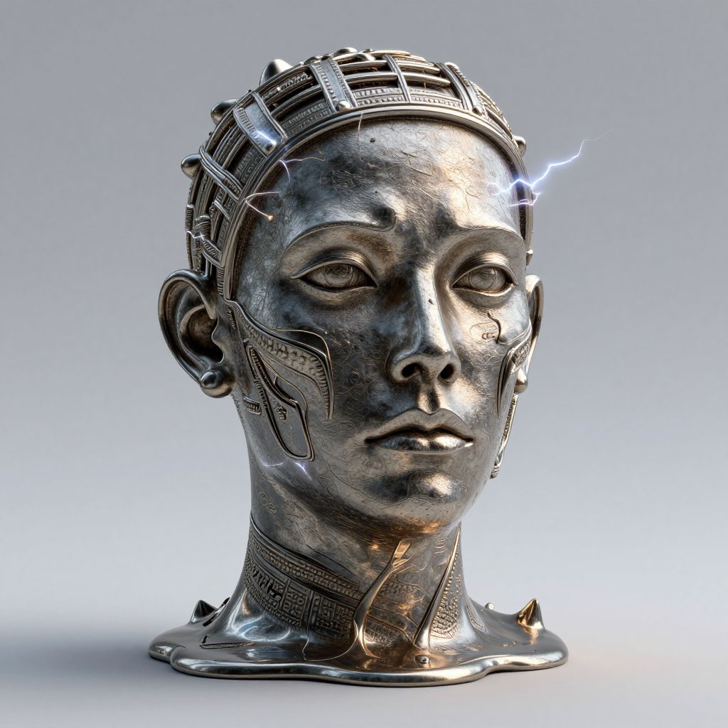 3 d render of a carved melted human head, sculpture, chrometype, liquid metal, neotribal, raytraced, volumetric lightning, 8 k, by zhelong xu, tooth wu, wlop, ouchh and and innate studio