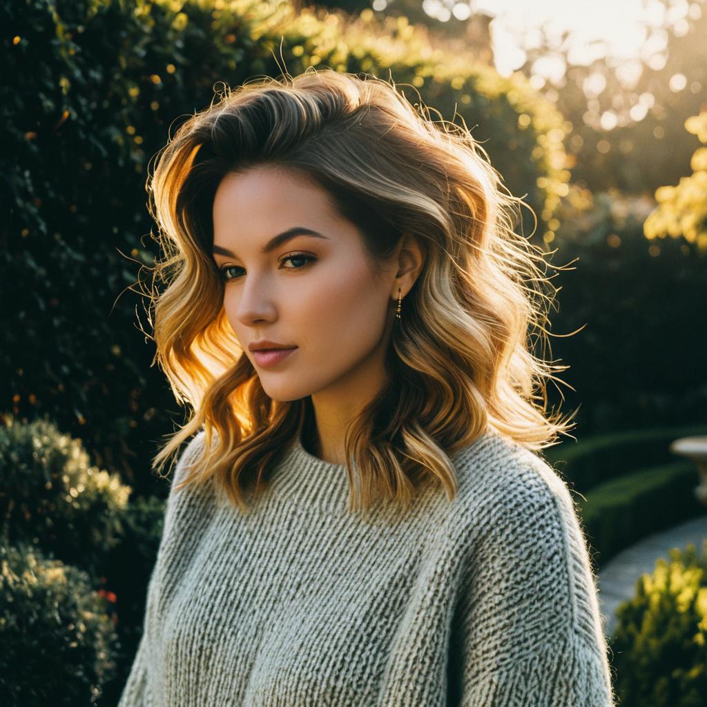 Green fur coat costume, 1girl, solo, coat, sweater, looking at viewer, blurry background, blurry, green coat, realistic, hands in pockets, blonde hair, lips, turtleneck, upper body, outdoors, brown hair, multicolored hair