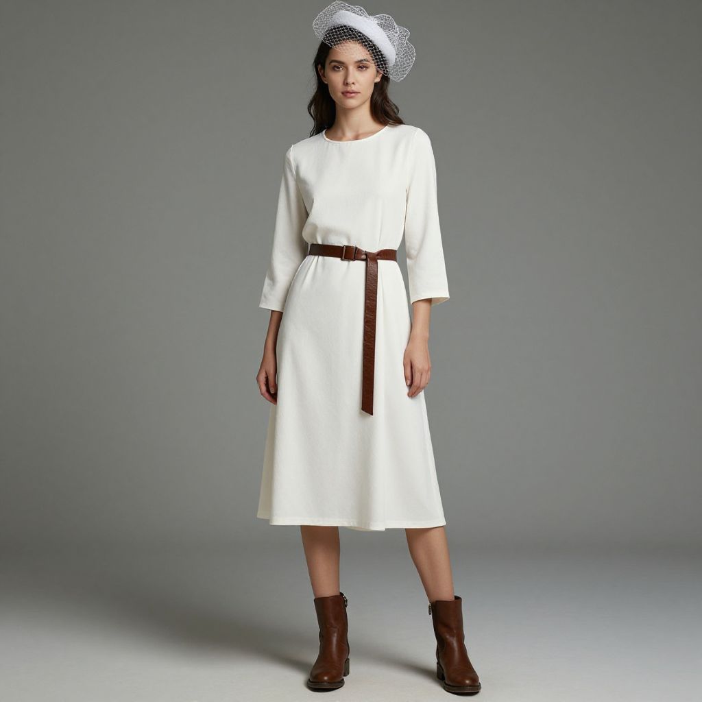 A woman is wearing a white dress with a brown belt around her waist. She has a white veil on her head and is wearing brown boots.