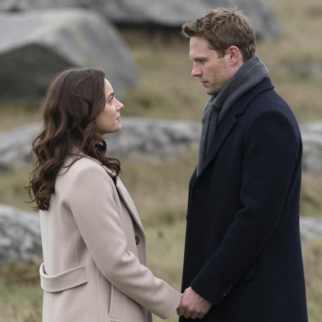 Photograph of a silhouetted scene with a blonde woman in a beige coat and a dark-haired man in a dark sweater, facing each other and clasping hands. Bright stage lights in the background create a dramatic, glowing effect. The woman sits, while the man kneels, both looking intently at each other.
