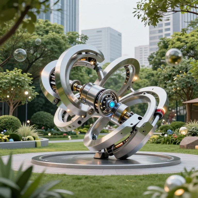 Kinetische sculpture in a futuristic urban park, intricate metal parts moving smoothly with magnetic bearings, surrounded by lush greenery and soft glowing lights, dynamic motion captured in bright daylight, hyperrealistic style