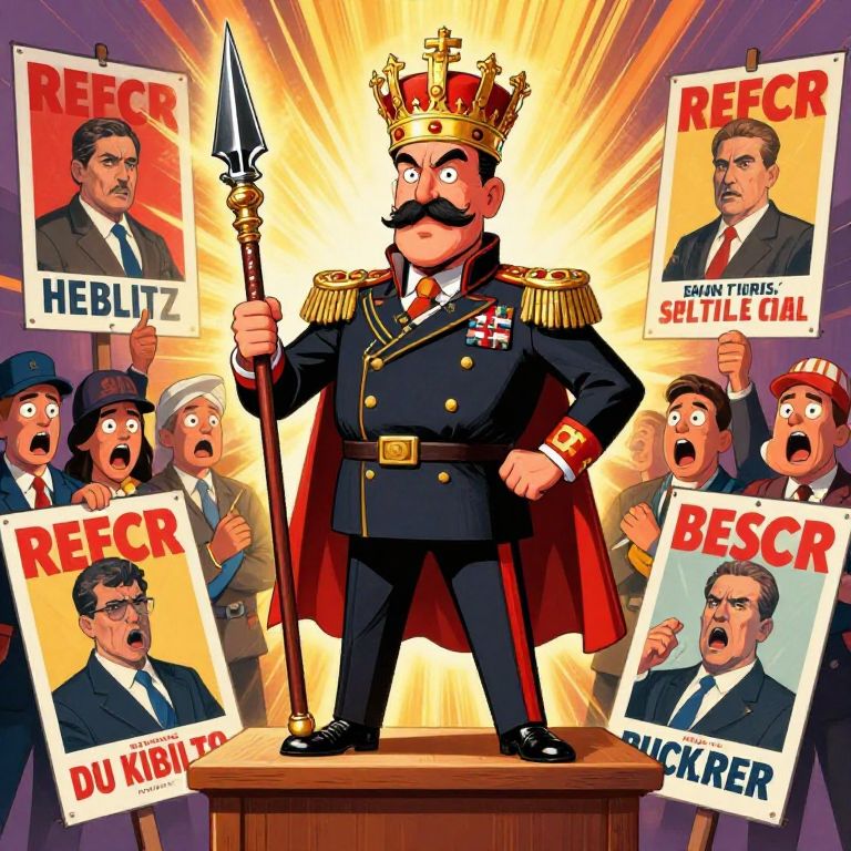Dictator political cartoon depicting a caricature of a political dictator with an exaggerated crown and scepter made of weapons, standing on a podium surrounded by propaganda posters, with frightened people in the background, colorful and dynamic artwork.