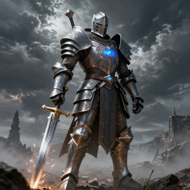 Digital artwork of a towering, armored knight in medieval fantasy style. The knight wears intricately detailed, silver plate armor with glowing blue runes on the chest and shoulders. His helmet is featureless and metallic. He holds a large, glowing sword with a golden hilt, from which sparks fly. The background features a stormy, cloudy sky with dramatic lighting, and ruins of a medieval castle in the distance. The knight stands on a rocky, desolate landscape, exuding an aura of power and intimidation. The overall mood is dark and epic, with a strong contrast between the shining armor and the dark, ominous sky.