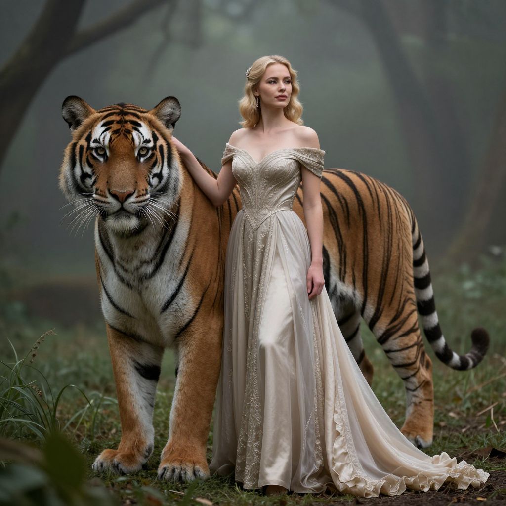 A regal blonde woman in an elegant off-the-shoulder gown stands serenely beside a majestic tiger in a misty forest, defying the natural boundaries between predator and protector in a dreamlike, fantastical tableau.
