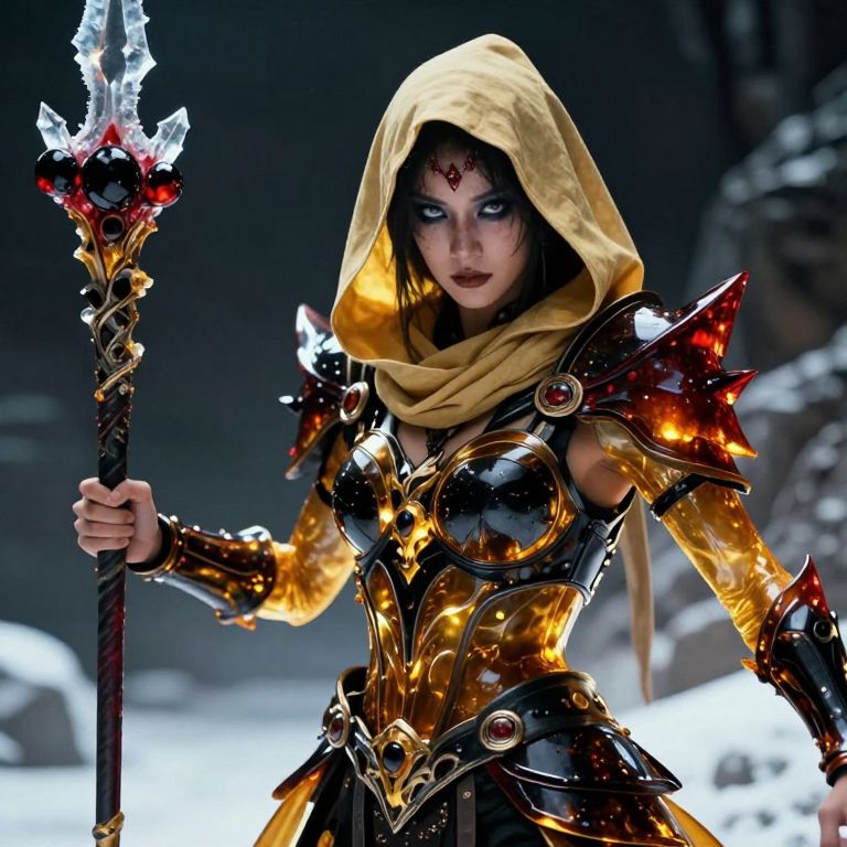 The goddess of war, Extreme Upper Body Closeup Portrait, Vibrant Amber and golden-black color graded, Face and eyes shaded By the oversized Linen hood, AmanoER, analog Photo of a eerie armored bedouin Warrior witch with a staff full of crystals, the crystals are round translucent black-red, hknature ninja-goddess, action pose, featuring a stylized, a ninja with translucent dark-red ice-based powers, He is depicted standing in a snowy, shadowy background, giving an action pose, Casting a spear Made of ICE and frost, The glowing dark outlines defines the character's muscular physique, ornate suit of armor, The armor includes a translucent amber and black chest piece with intricate Design