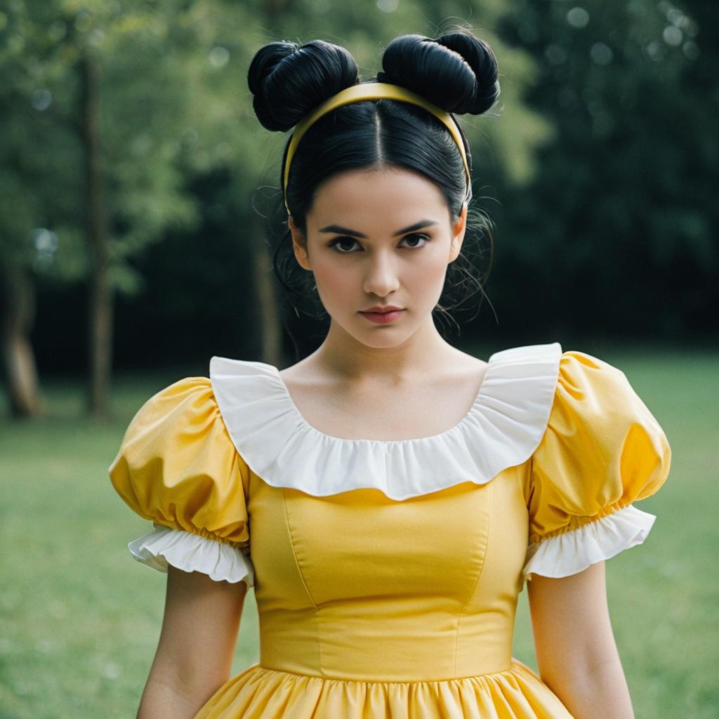 Portrait of a young woman with long black hair styled in double hair buns wearing a yellow dress with white ruffled collar and puffy short sleeves. She has a yellow hairband and is standing outdoors in a green, blurred background, looking directly at the camera with a serious expression.