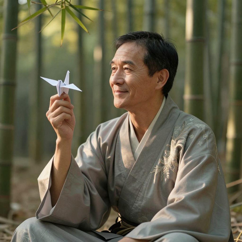 Photograph of an Asian man in a gray kimono, holding a white paper crane, sitting in a bamboo forest, smiling.