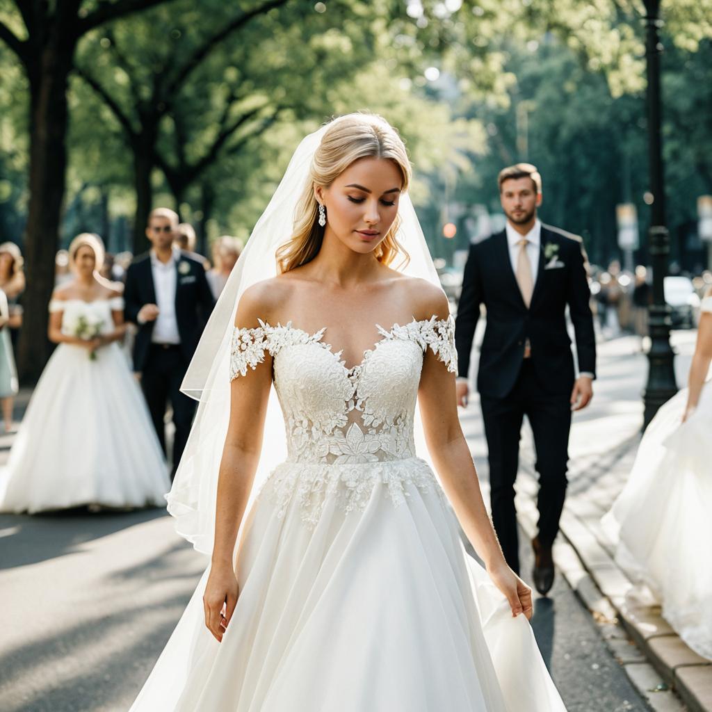 Bridal dress party wear, photorealistic, wedding dress, bride, blonde woman, off-the-shoulder lace bodice, white veil, full skirt, sunlight, street background, green trees, blurry pedestrians, daytime, elegant, romantic, outdoor, fashion photography, realistic lighting, detailed ures, soft focus, bridal gown, summer dress, European street, beautiful, classic wedding style