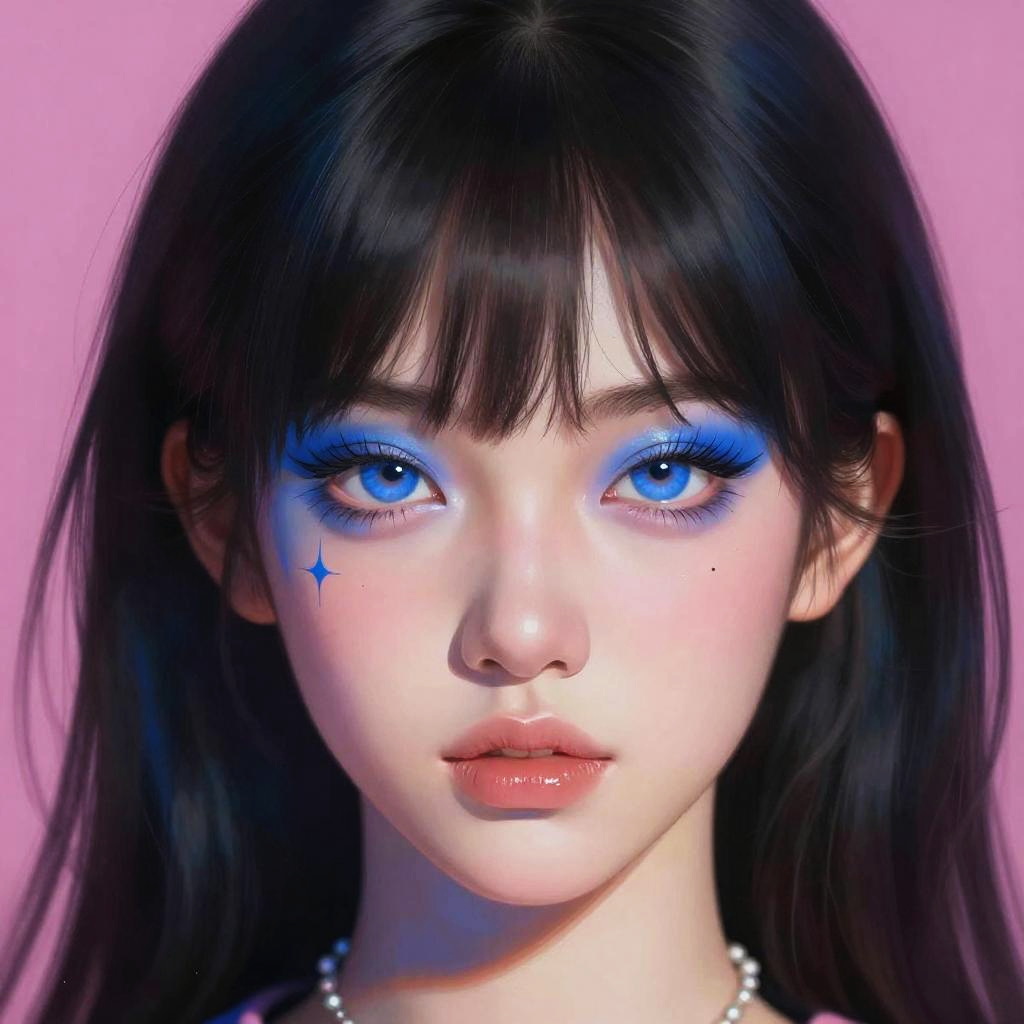 This vibrant illustration features a captivating young woman with striking blue accents on her face, embodying a stunning blend of modern fantasy and digital artistry. Her enchanting gaze and intricate details reflect a unique style that merges anime influences with contemporary color palettes, making it a perfect addition to any art collection.