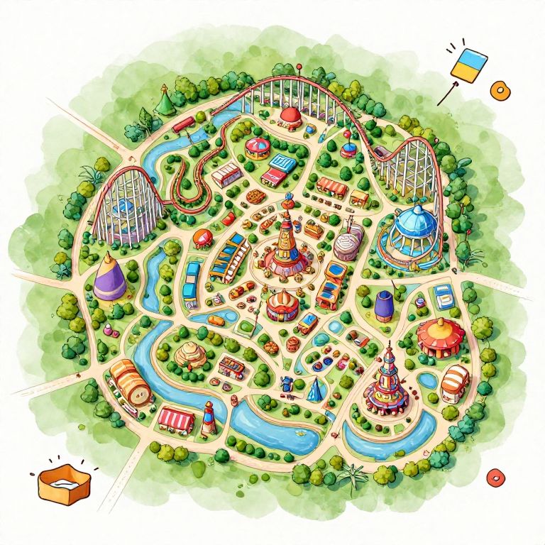 Theme park map maker designing a vibrant, detailed theme park layout, featuring winding roller coaster tracks, colorful attractions, food stalls, and lush greenery, rendered in a whimsical, hand-drawn watercolor style with playful annotations and icons.