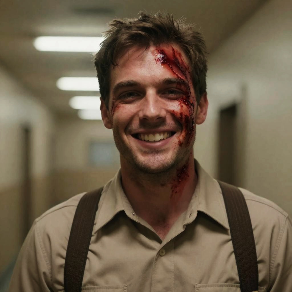Photograph of a man with short brown hair, blood on his face and shirt, smiling intensely. He wears a beige uniform with dark suspenders. Background: dimly lit, beige corridor with fluorescent lights. Upper body shot, close-up.