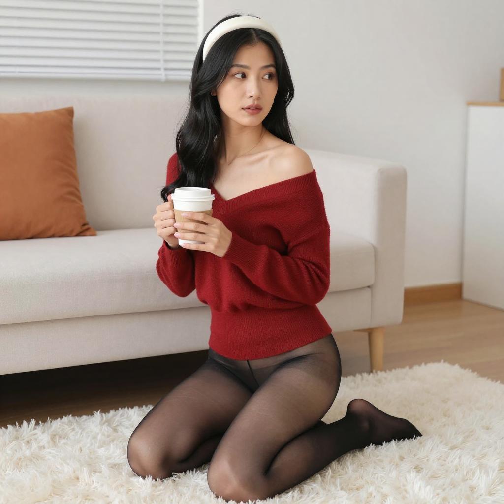 Digital artwork of an Asian woman with long black hair and bangs, wearing a red sweater, white headband, and black sheer pantyhose, sitting on a white fringed chair. She has one arm raised and one leg crossed over the other, with black shoes on a white circular base. Background features white blinds and beige cushions.