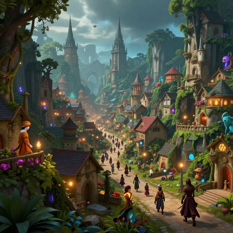 Fantastical CGI scene of a vibrant, fairy-tale village with glowing lights, medieval buildings, and a bustling cobblestone street, surrounded by