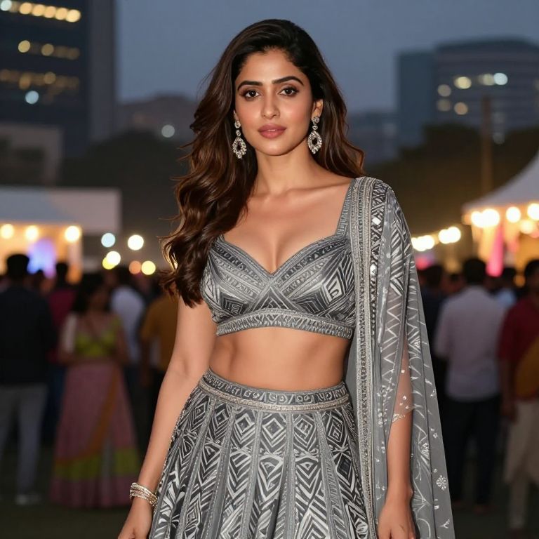 A glamorous actress with medium brown skin, round face, and expressive eyes, wearing a sleek grey colour lehenga with a bold geometric pattern, standing at a rooftop festival in Mumbai, with evening city lights glowing behind her and a vibrant crowd in the background