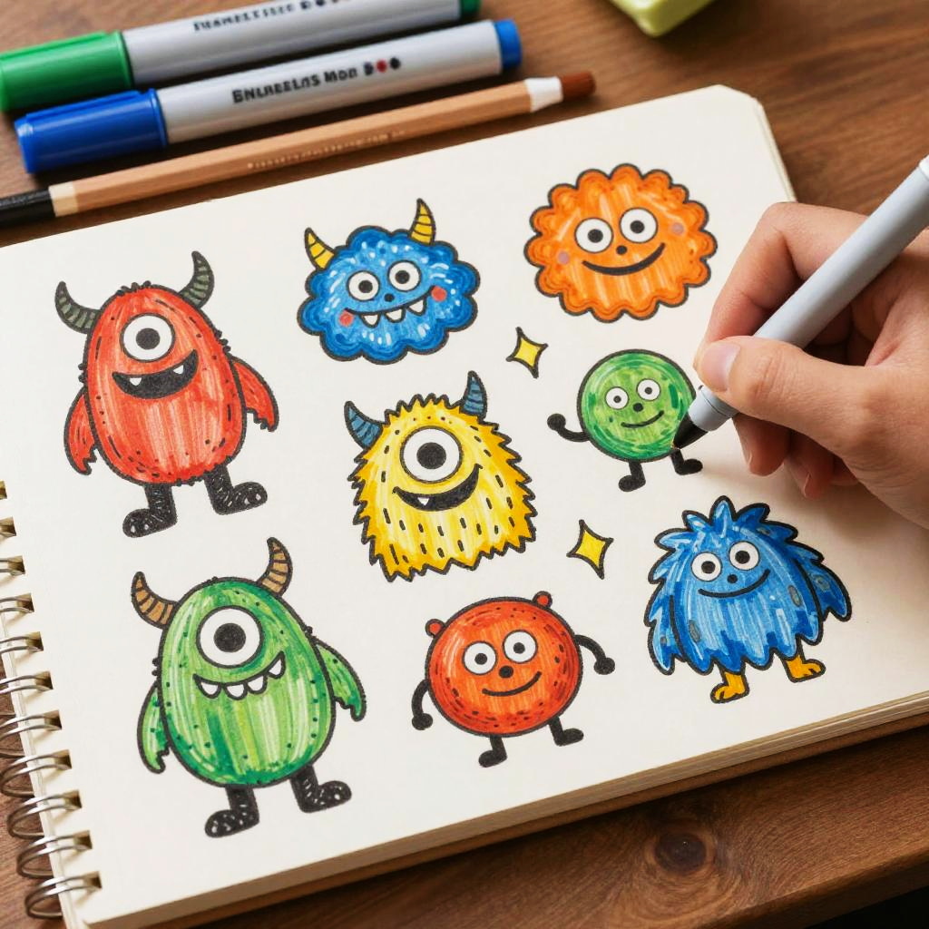 Doodle maker crafting imaginative cartoon monsters and funny creatures on a sketchpad, vivid markers and pencils around, warm lighting, expressive and humorous style, emphasis on creativity and fun in a relaxed setting