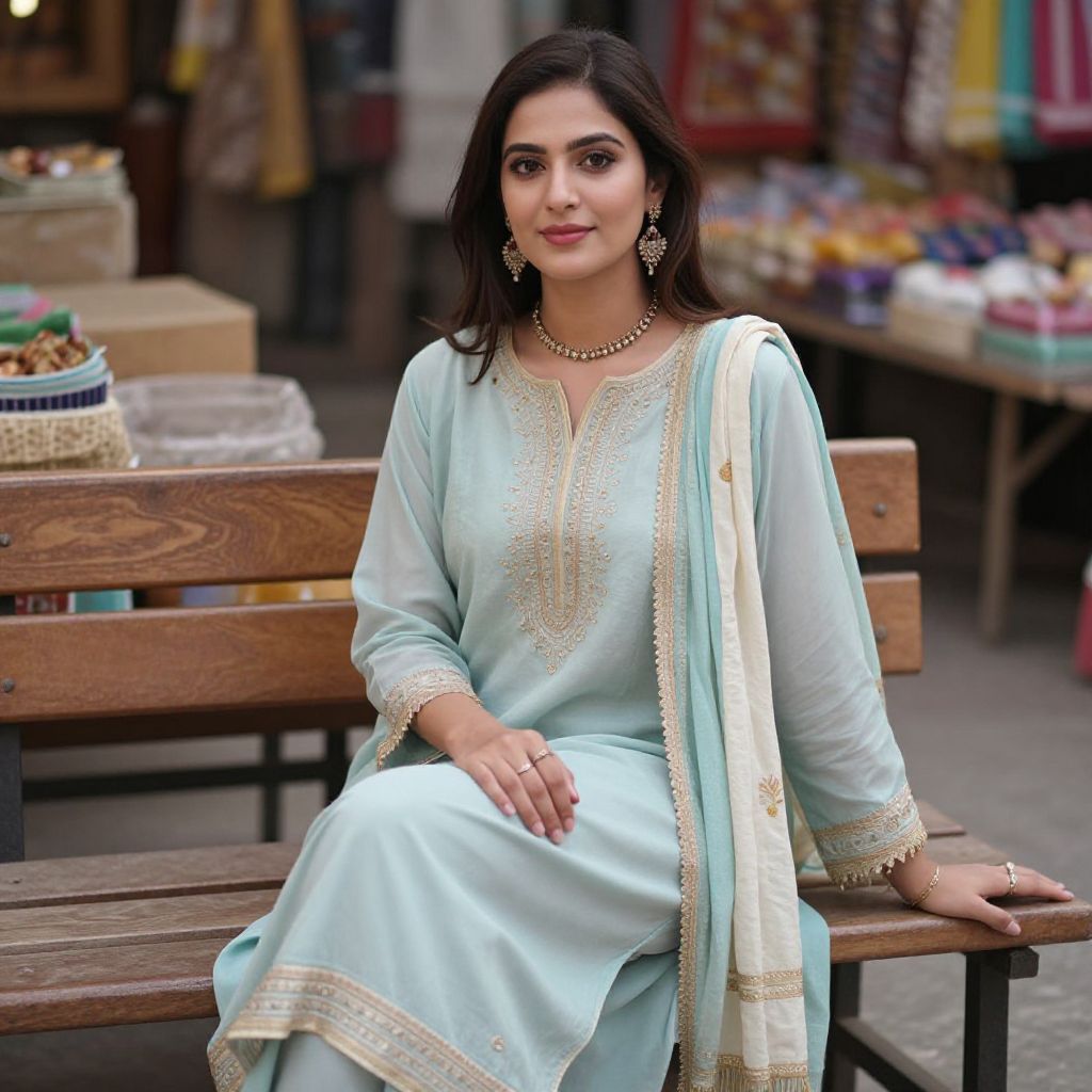 Pakistani shalwar kameez styled with modern cuts and pastel tones, a woman in her 30s wearing it with a delicate necklace and saree scarf, sitting on a wooden bench in a quiet market, natural lighting, cultural authenticity, soft focus, MidJourney style.