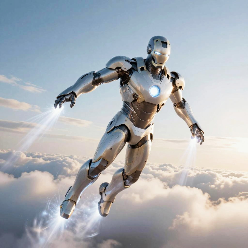 CGI image of a silver, armored Iron Man flying through a bright, cloudy sky, emitting glowing blue energy from chest and hand repulsors.