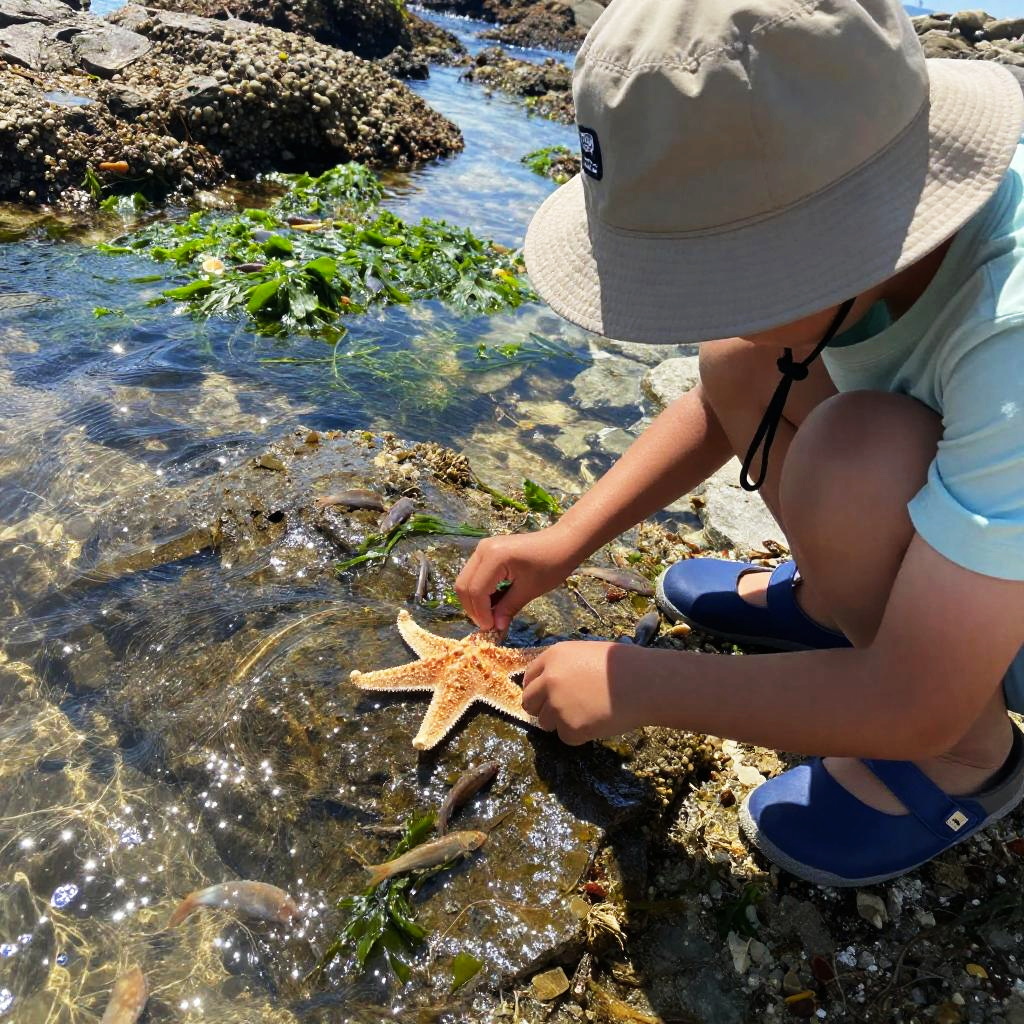 11 year old boy exploring tide pools on a rocky beach, examining starfish and small fish with fascination, wearing a bucket hat and light shorts, sparkling clear water reflecting sunlight, natural rugged coastline with green seaweed patches, adventurous and curious mood