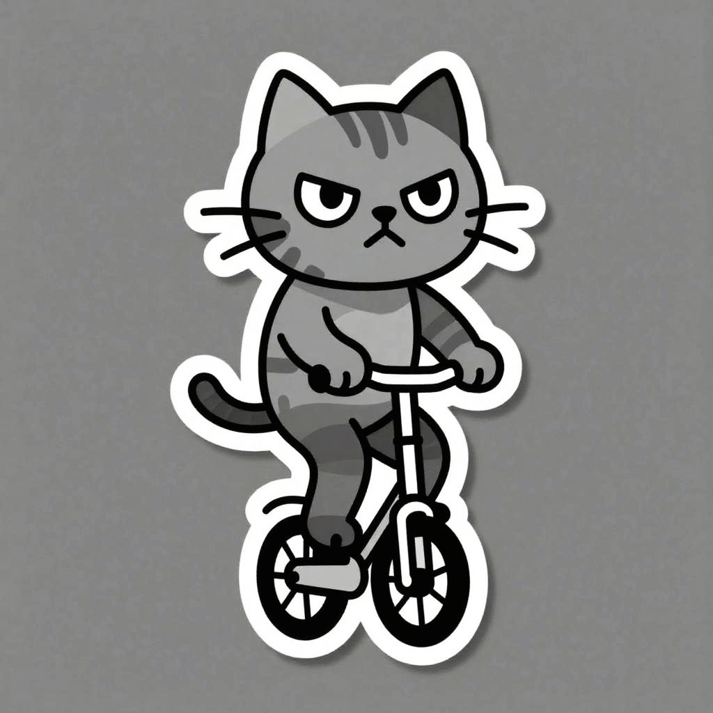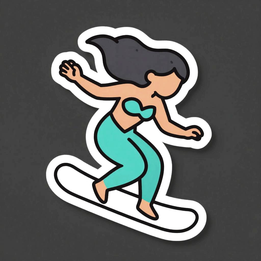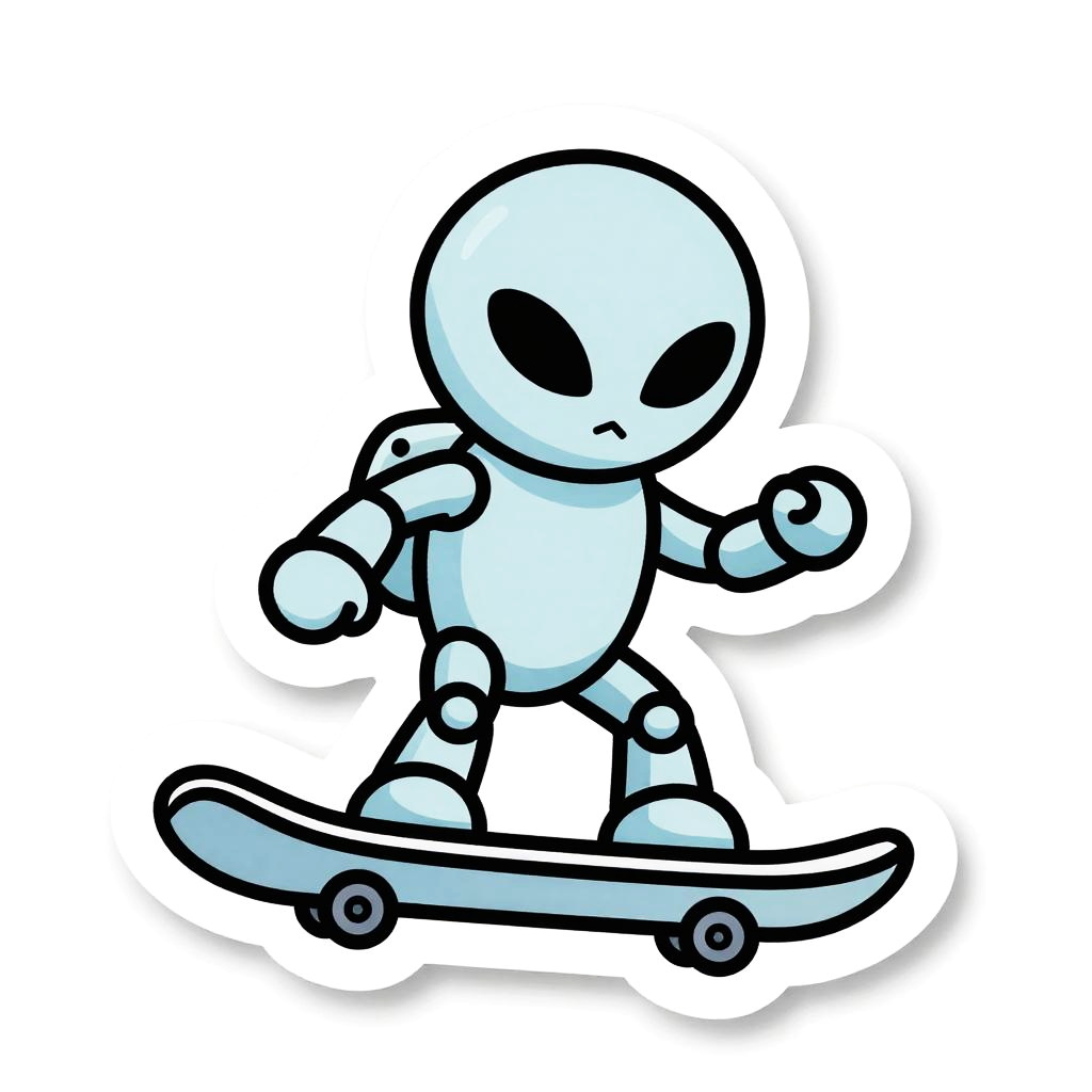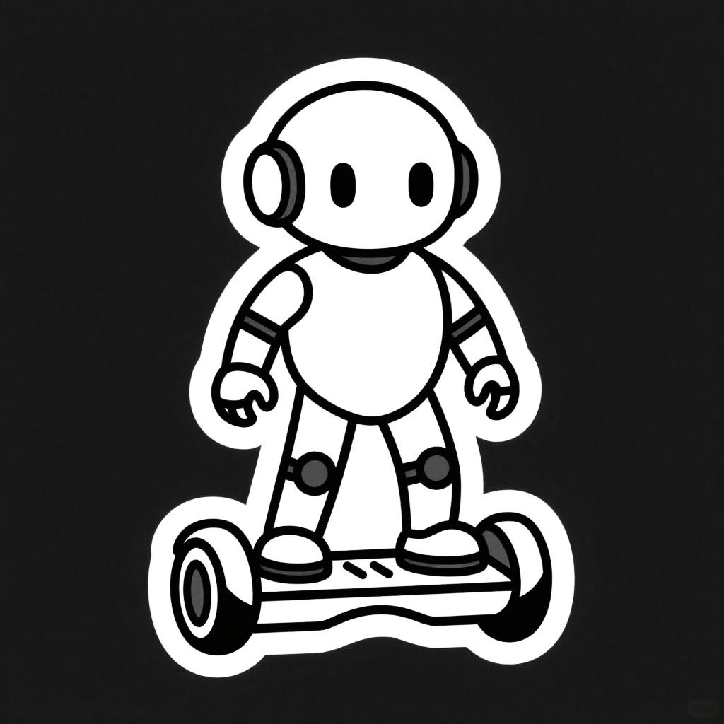 A cyborg riding a hoverboard, illustrated as a die-cut sticker. Simple, clean vector line art, with flat colors and a monochrome background. HDR, ultra-detailed, crisp outlines, cartoon aesthetic