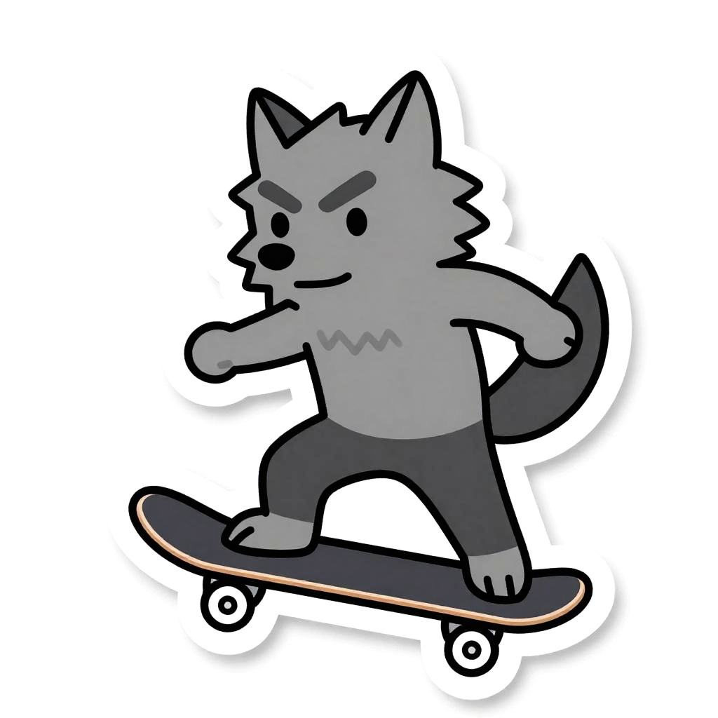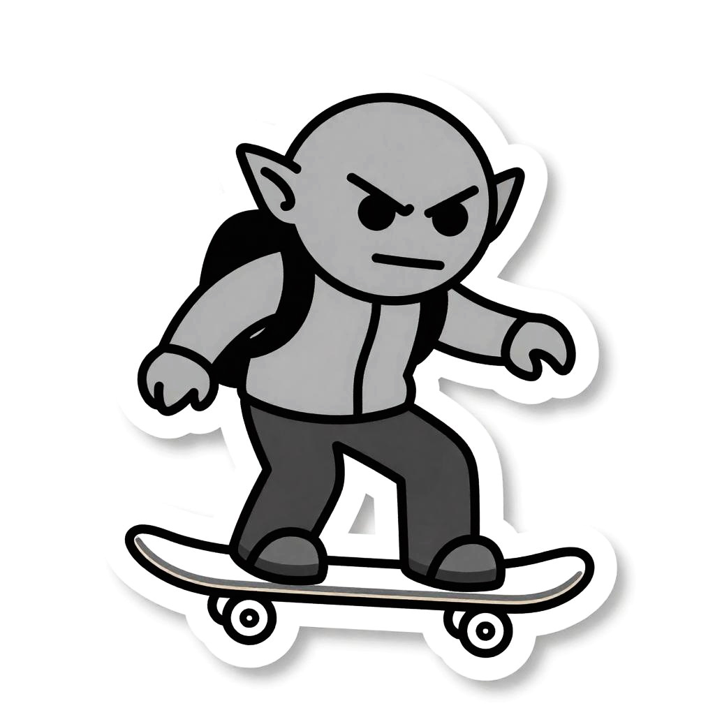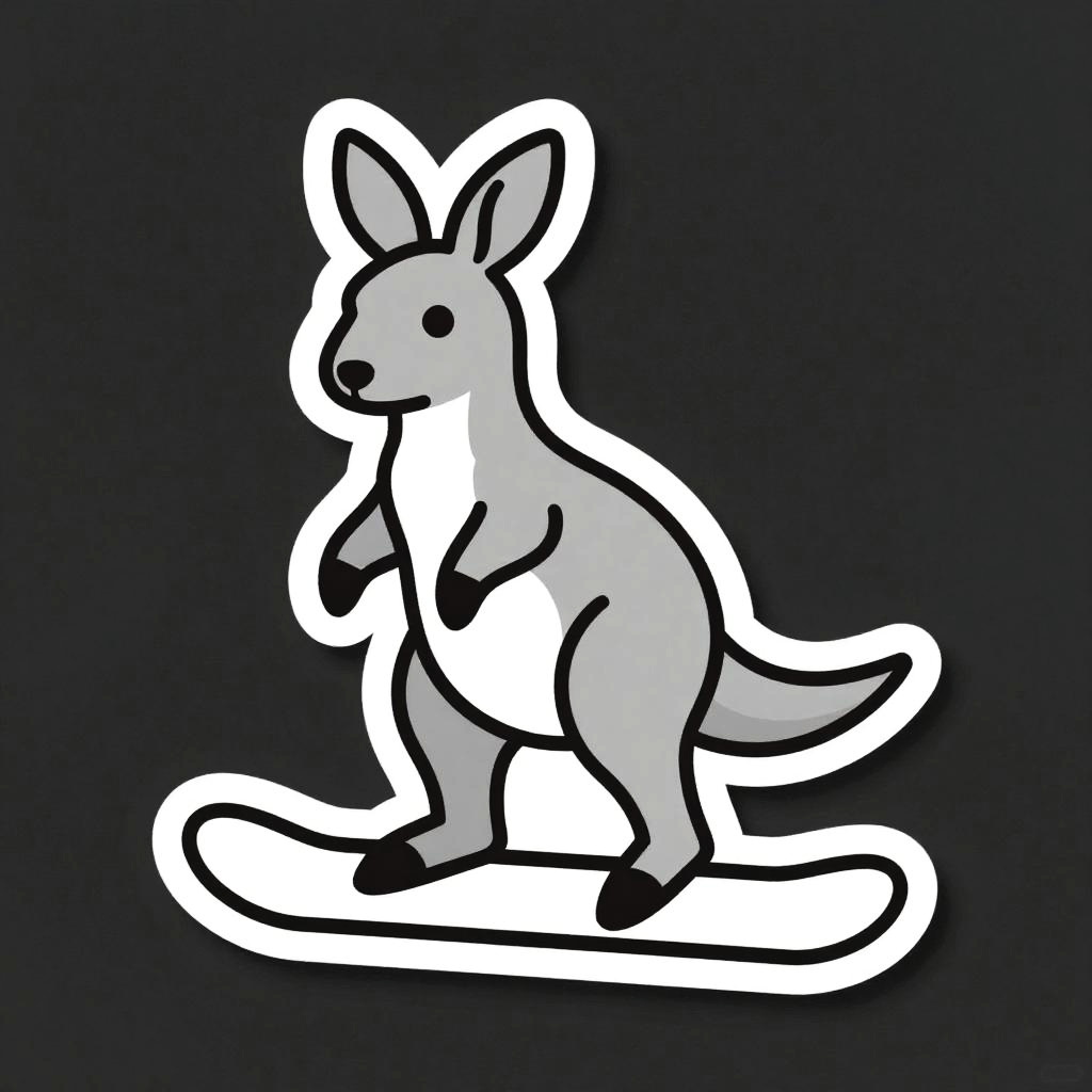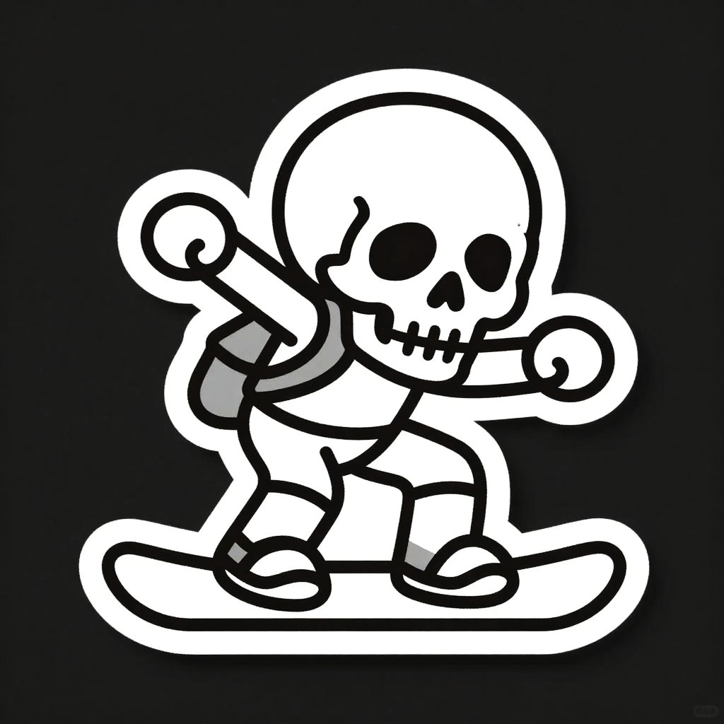 A cyborg riding a hoverboard, illustrated as a die-cut sticker. Simple, clean vector line art, with flat colors and a monochrome background. HDR, ultra-detailed, crisp outlines, cartoon aesthetic