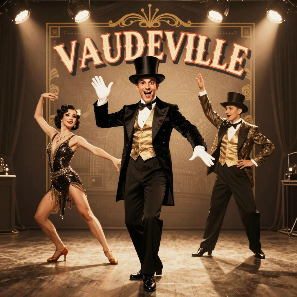 Vaudeville show poster style artwork featuring a charismatic magician, a tap dancer, and a comedic duo, vibrant retro fonts and decorative borders, evoking the bustling entertainment vibe of 1920s variety theaters with a sepia-toned background and spotlights.