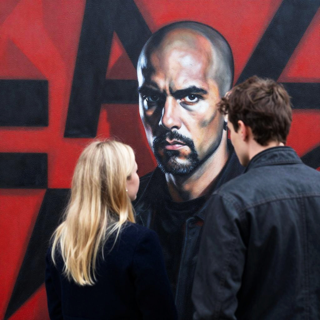 Photograph of two people standing in front of a large, red and black abstract mural. Mural features a close-up of a bald man with a goatee, intense expression. Blonde woman with straight hair, wearing dark coat, faces man with short brown hair, back to camera, wearing dark jacket. Mural's red and black geometric patterns dominate background.