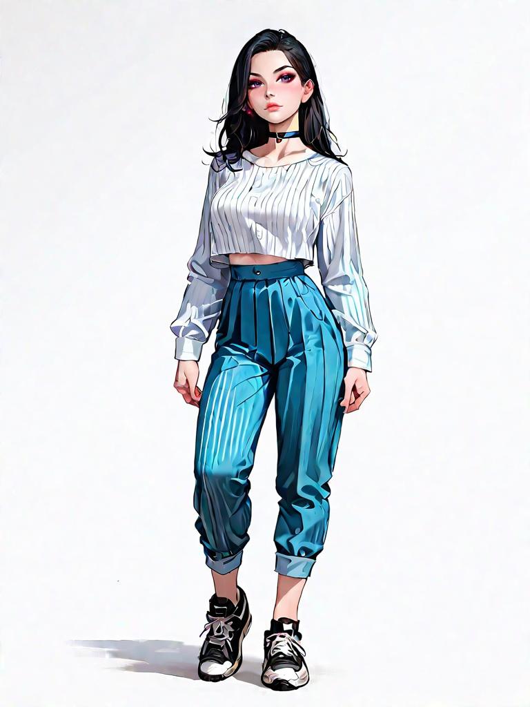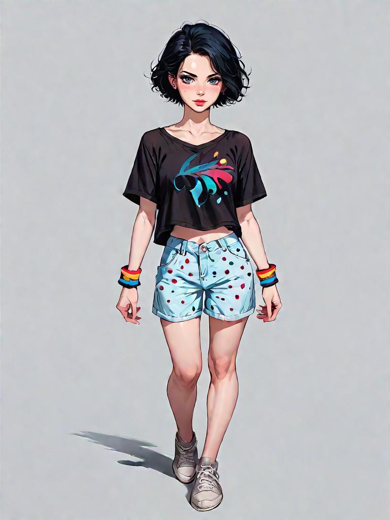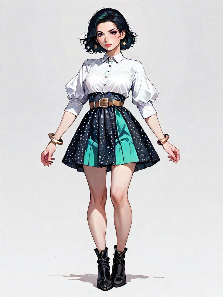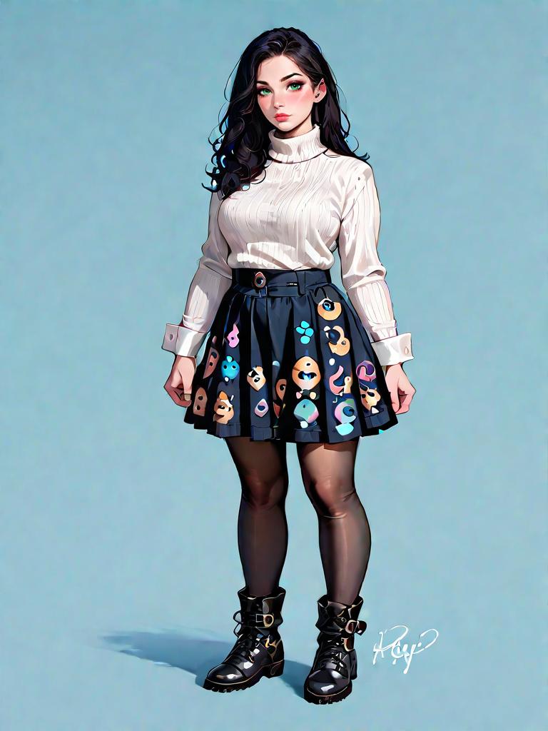 1girl, source_comics, realistic face, full body shot, Woman, boho chic, chunky knit sweater in burgundy with multicolor Fair Isle pattern, crew neck, ribbed hem and cuffs, layered over a cream lace mini skirt, sheer black tights, black ankle boots with a chunky wooden heel and elastic side panels, neutral studio background.