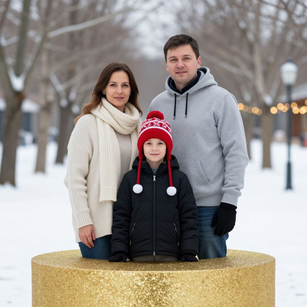 Winter family portrait featuring three individuals dressed warmly in winter attire, including a woman in a cream cardigan and scarf, a child in a red hat and black jacket, and a man in a gray hoodie, all standing outdoors in a snowy landscape with bare trees and festive lights blurred in the background, displayed on a golden glittery stand.