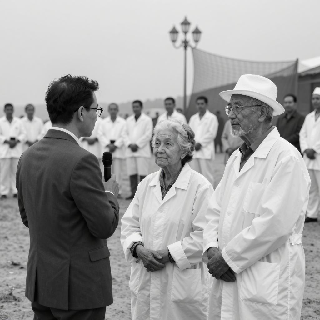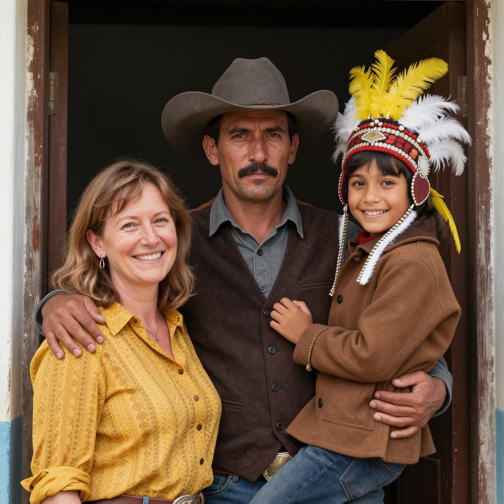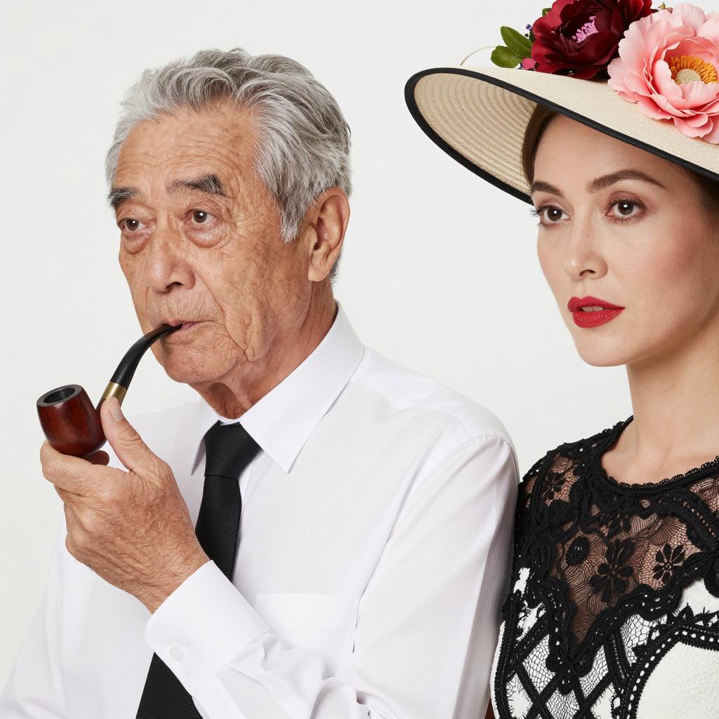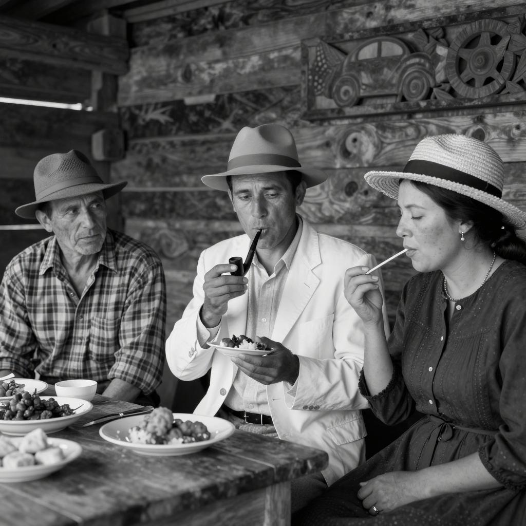 Three individuals sitting in a rustic wooden cabin. The man in the center wears a white suit and hat, smoking a pipe and holding food. The woman on the right wears a dark dress and straw hat, eating food from a stick. The man on the left is dressed in a checkered shirt and hat. A wooden table with plates of traditional food is in front of them. The background features a wooden wall with intricate carvings.