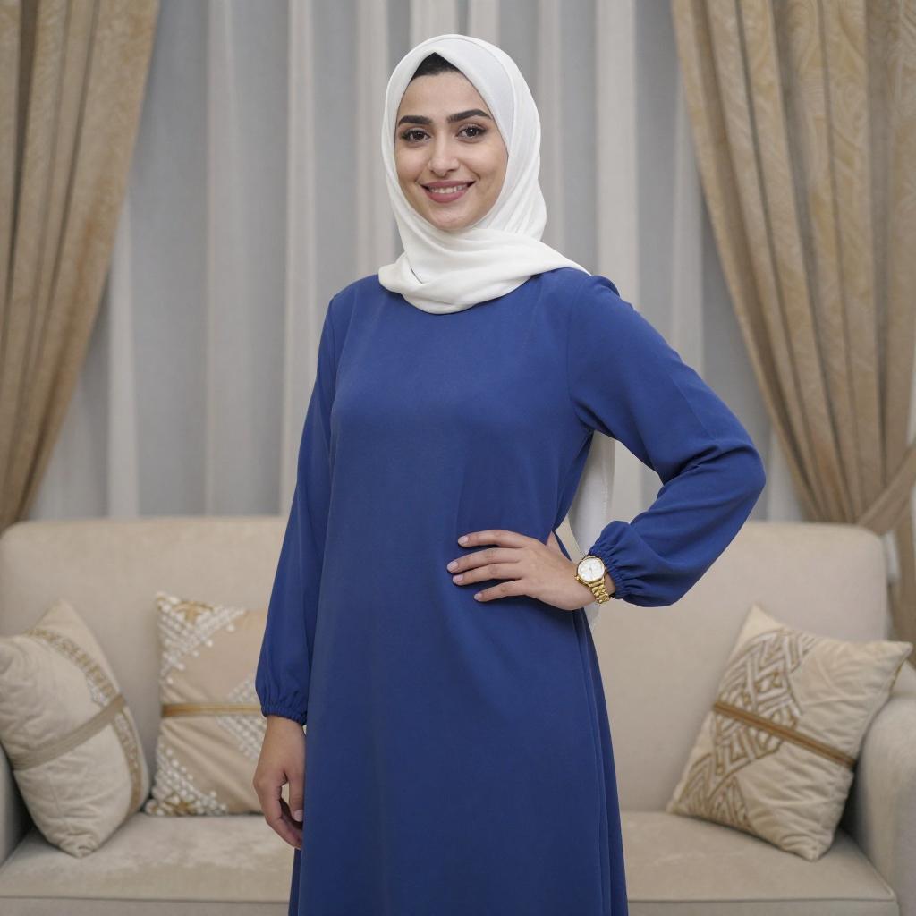 Photograph of a young woman with light skin and brown eyes, wearing a light purple long-sleeve top and matching high-waisted pants. She has a beige hijab with green accents and holds a white handbag. She leans against a wooden table, smiling slightly, with a bright window and dark door in the background.
