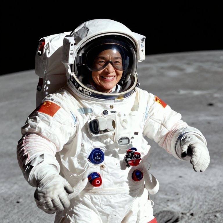 Aviator Goggles my mom with a big smile on her face in a astronaut suit, first step on the moon, Chinese flag,