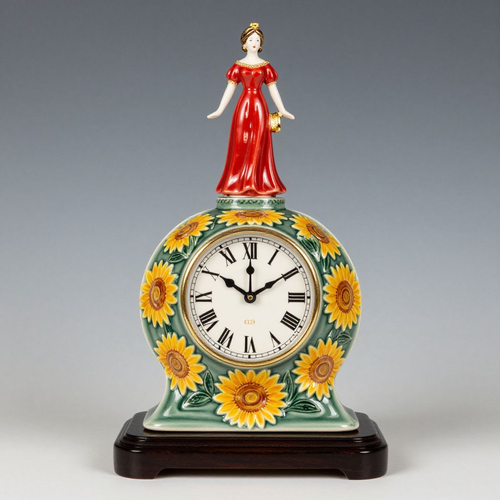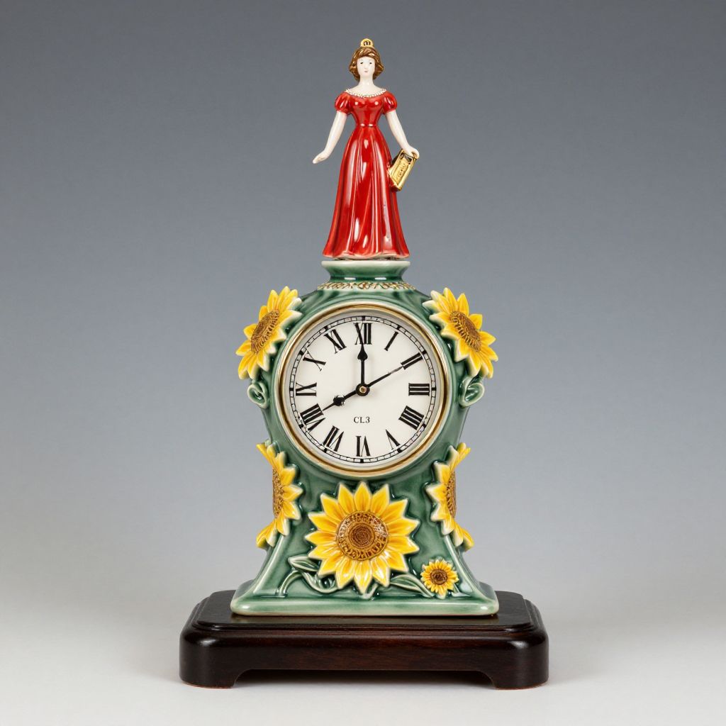 Moorcroft Pottery's Queen's Choice CL3 Clock, featuring Emma Bossons' design, showcases a green ceramic body adorned with sunflower motifs and a central clock face marked with Roman numerals, topped by a figurine of a woman in a red dress, all resting on a dark wooden base.