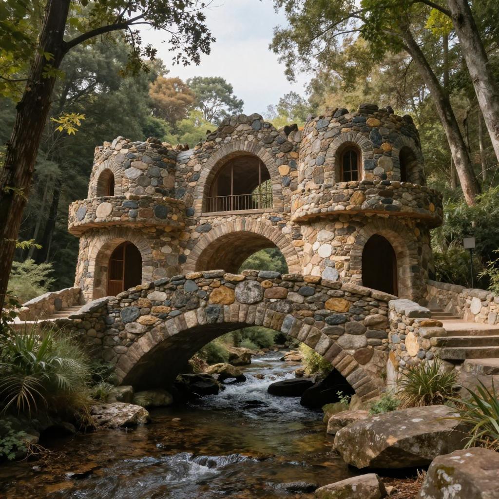 Majestic rustic stone building designed as a castle, seamlessly bridging a flowing forest stream. The structure features arched windows and doorways with a rounded design, constructed from natural stones in earthy tones. Surrounded by dense forest trees and soft natural light, the scene highlights harmony between architecture and woodland environment.