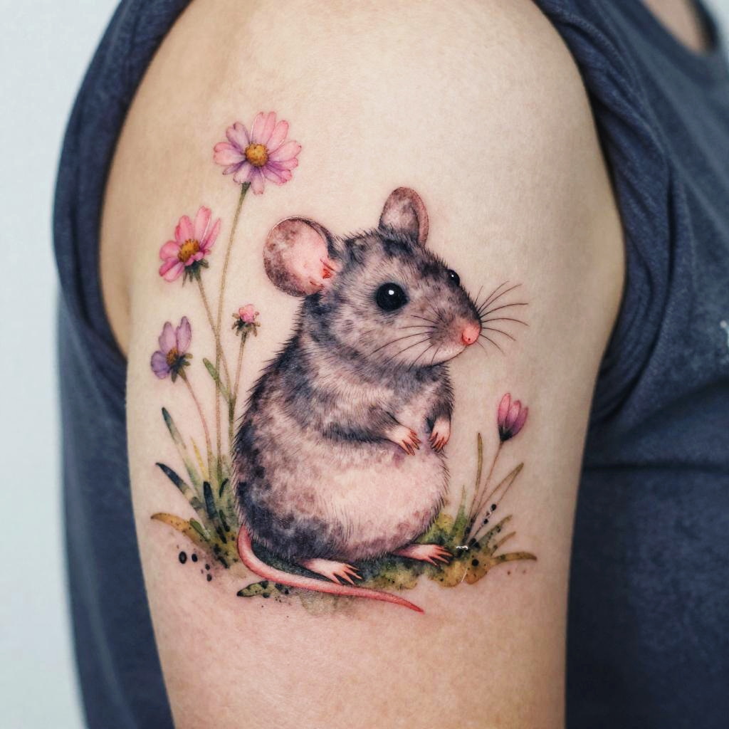 Cute mouse tattoo featuring a cozy mouse nestled among blooming wildflowers, watercolor style blending soft shades of gray and pink, elegant and serene composition suitable for a shoulder or calf tattoo, emphasizing lightness and tenderness.