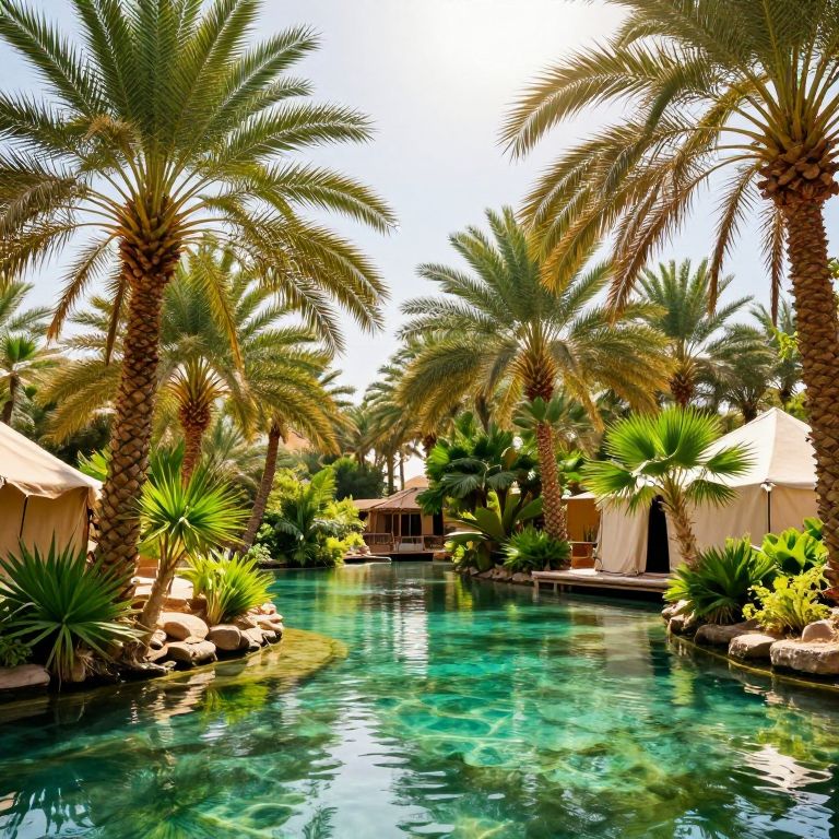 Marwan exploring a lush oasis in the desert, vibrant green palms and crystal clear water reflecting a bright sun, traditional tents nearby, tranquil and inviting setting, rich natural colors and detailed flora and fauna.